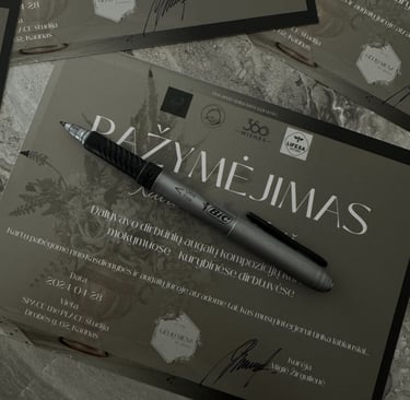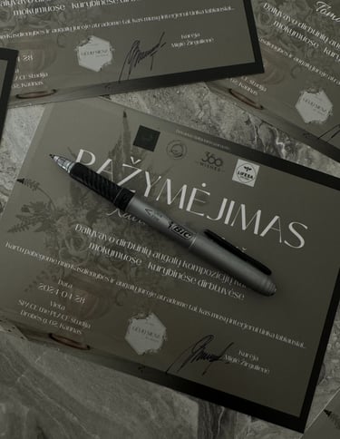 Visos gamybos priemonės yra įskaičiuotos į kainą! Jūsų sukurta kompozicija ir kompetenciją įrodantis pažymėjimas atitenka Jums